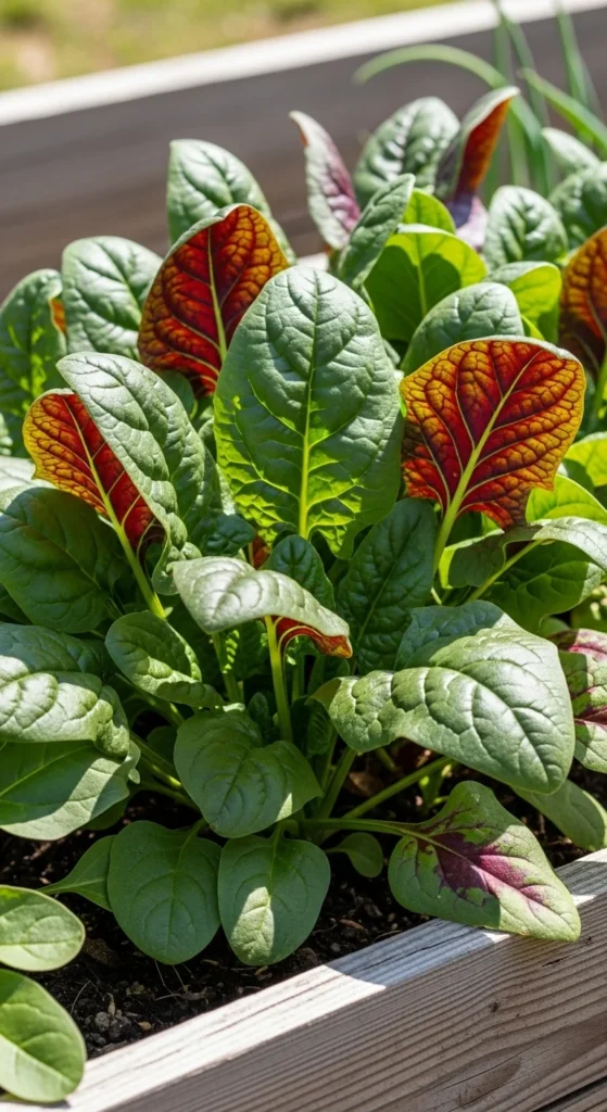 Plant different spinach varieties—‘Red Veined,’ ‘Bloomsdale,’ and ‘Malabar’—for diverse shapes and hues. This combo stays productive in mild winters and early spring. Mix them tightly for lush coverage that looks ornamental and feeds you well. Regular trimming encourages new growth.