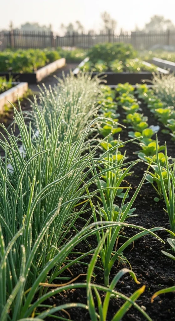 Border vegetable plots with chives and garlic greens for natural pest control and subtle architecture. Their upright form frames beds neatly while feeding your kitchen. Snip tops regularly to encourage new shoots, and enjoy year-round seasoning right at your garden’s edge.