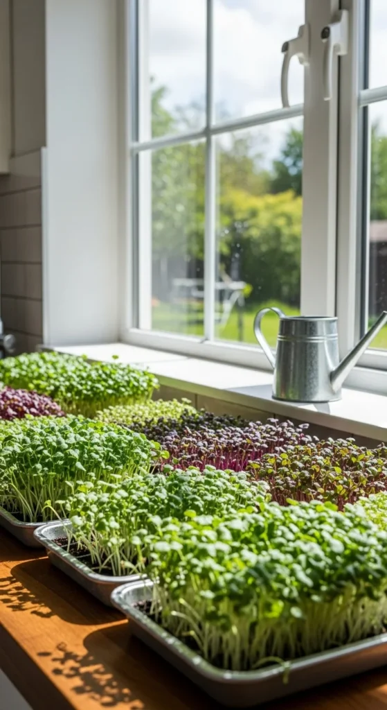 If outdoor space is limited, grow microgreens indoors. Use shallow trays filled with seed mix—radish, mustard, or arugula. Place them near a sunny window for quick growth. They’re ready to harvest in two weeks and look decorative with their lush green mat of baby leaves.