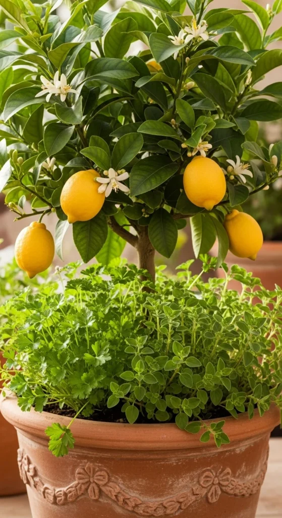 Combine a dwarf citrus tree with leafy herbs in the same pot. The herbs cover the soil, retain moisture, and add a layered visual effect. Citrus leaves and fruit bring brightness even indoors. Use a large terracotta pot for proper drainage and stability.