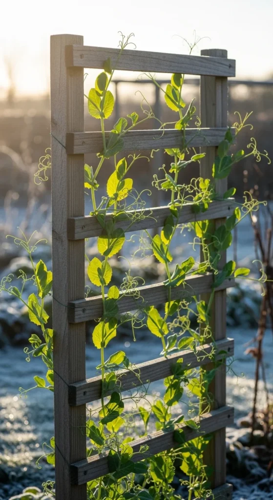 Create vertical interest with a simple trellis for pea shoots. Their delicate tendrils and small leaves look graceful while producing edible greens. Use bamboo sticks or metal mesh for support. Keep soil slightly moist, and harvest shoots when tender for salads or stir-fries.