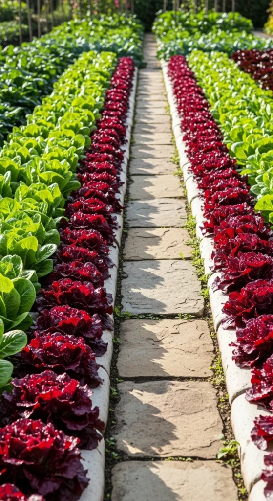 Lettuce grows fast and comes in endless colors. Create a patterned edge along your walkway with butterhead, romaine, and red leaf varieties. Stagger planting for a continuous harvest. The contrast between shades adds polish to your garden path while giving you crisp greens for meals anytime. It’s easy, budget-friendly, and turns utilitarian space into edible decor.