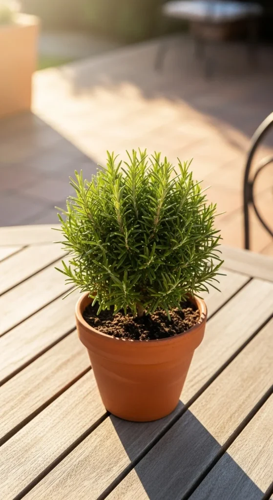 Train rosemary into a small topiary form using pruning shears. It adds structure and fragrance to any garden spot. The evergreen leaves withstand cool conditions and provide year-round culinary use. A simple clay pot keeps it grounded and classic.