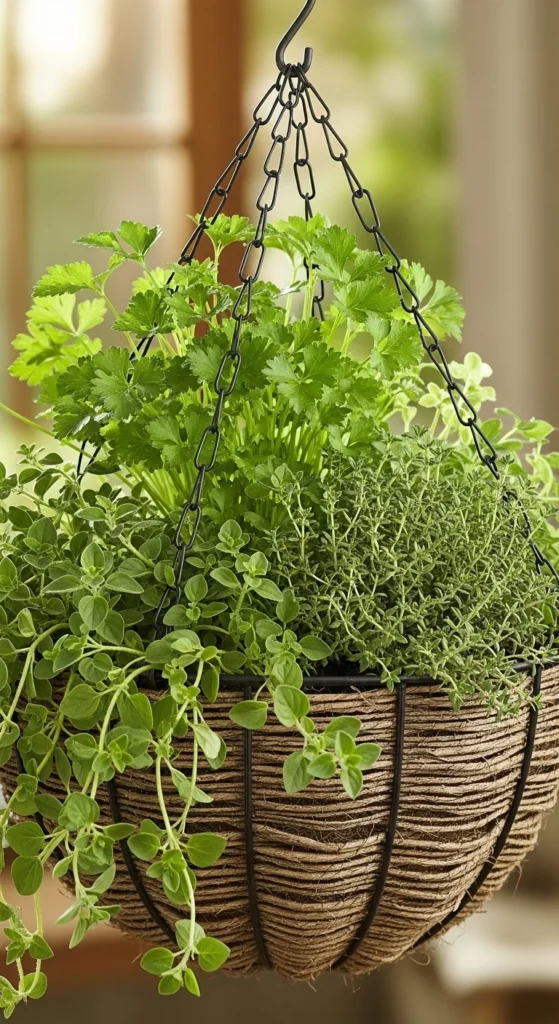 Hang a wire basket lined with coir and fill it with mixed herbs. Oregano and thyme trail beautifully while parsley fills the center. This hanging feature adds texture and scent at eye level, turning plain patios into functional art.