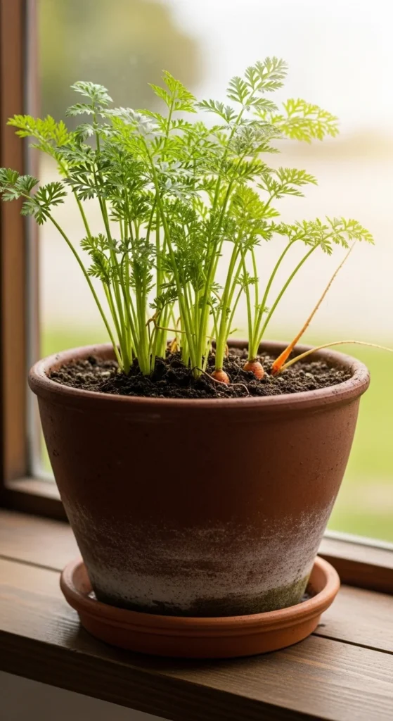 Don’t overlook carrot tops—they’re edible and decorative. Grow short carrot varieties in pots where the leafy tops form a dense crown. The fine-textured greens contrast nicely against heavier foliage plants. Use leaves for pesto or garnish once mature.