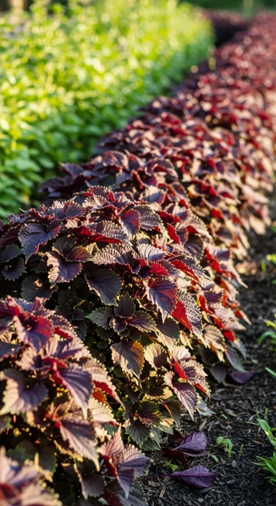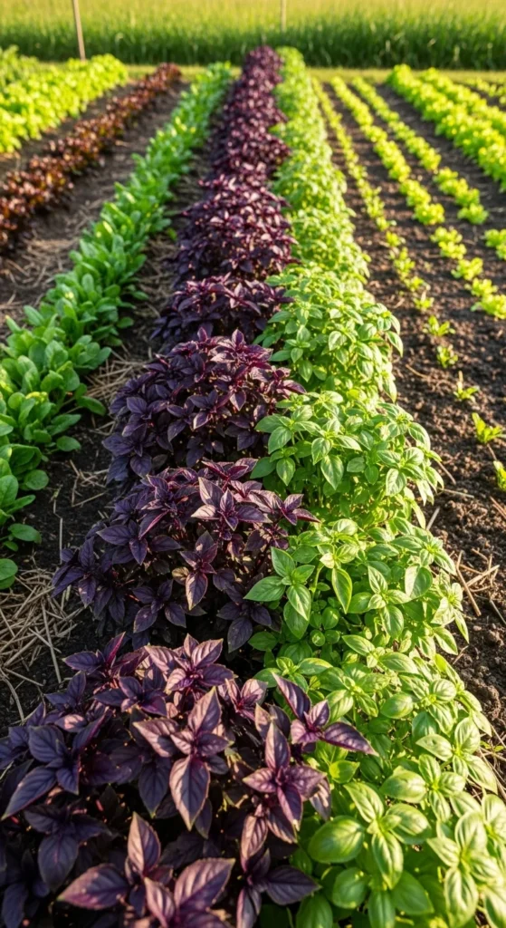 Plant Genovese and purple basil in alternating rows for a scented mini hedge. Trim regularly to keep shape and promote bushy growth. The glossy leaves create a uniform green-and-purple look while staying aromatic. Use cuttings in sauces, salads, or to garnish drinks straight from the garden.