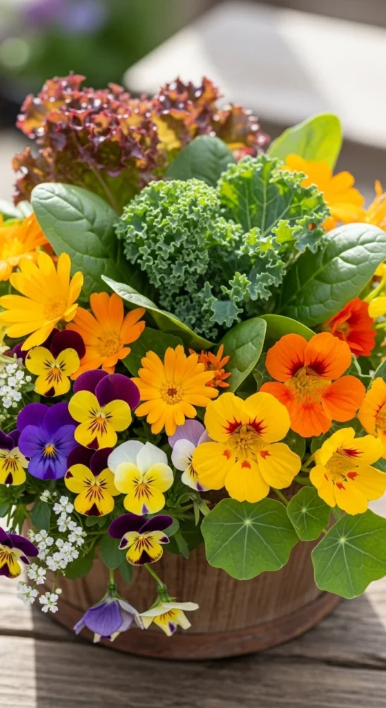 Add edible flowers like nasturtiums and calendula around the edges of leafy greens. Their petals brighten salads and attract pollinators while acting as natural pest control. Mix them into containers or garden corners for color pops that feel both wild and intentional.