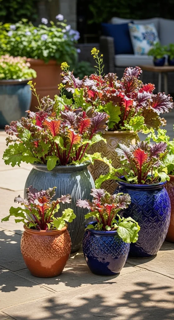 Red mustard greens grow fast and tolerate cool weather. Their maroon foliage stands out beautifully in ceramic pots or terracotta planters. Add them to entryways or balconies for rich contrast. They’re mild enough for stir-fries or fresh salads, making them a functional accent.