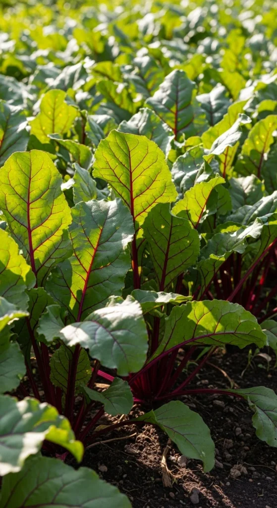 Beet greens are as pretty as the roots. Let a few plants grow mainly for their vibrant foliage, which works beautifully in mixed beds. Their red stems add color depth beside pale greens like lettuce. Harvest young leaves for cooking—sweet and earthy in flavor.