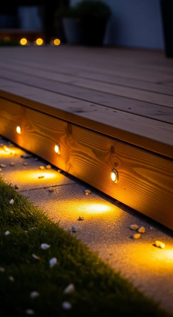 Low-level lights create a border around your deck. Install them along the outer frame. These lights guide guests and highlight seating areas. They use very little energy and last long. You can control them with a simple timer. Keep them spaced evenly for a clean look. Pair them with potted plants for added depth.