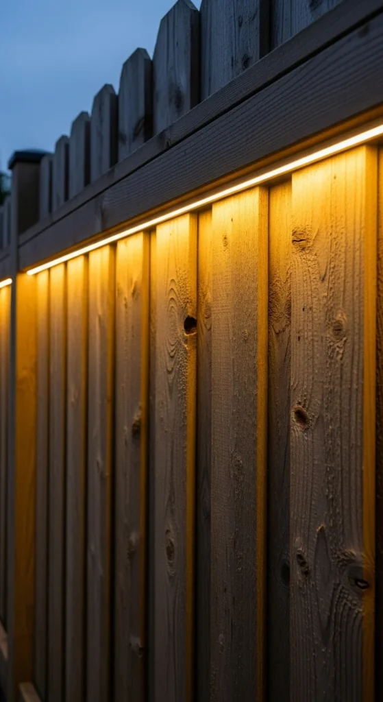 Lighting your fence gives the garden a gentle perimeter glow. Mount small LED strips or puck lights along the fence. Choose warm tones for comfort. This trick works well in narrow yards where bright lights feel overwhelming. Pair fence lighting with shrubs for added softness. Use weather-resistant fixtures to keep them working long-term.