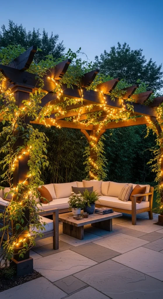 A lit pergola creates a cozy evening space. Wrap LED strips along beams or posts. Keep the lights hidden behind vines if you want a subtle glow. This works well for seating areas or dining spots. Use warm bulbs for a calming mood. You can place lanterns on nearby tables to complement the overhead light.