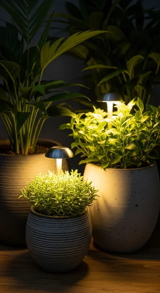 Accent container lighting spotlights your potted plants. Place tiny ground lights or LED pucks near the base of pots. Aim them upward to highlight foliage. This works especially well with tall containers. You can use battery-powered options for easy setup. Rotate lights when rearranging the patio.