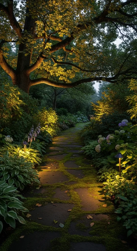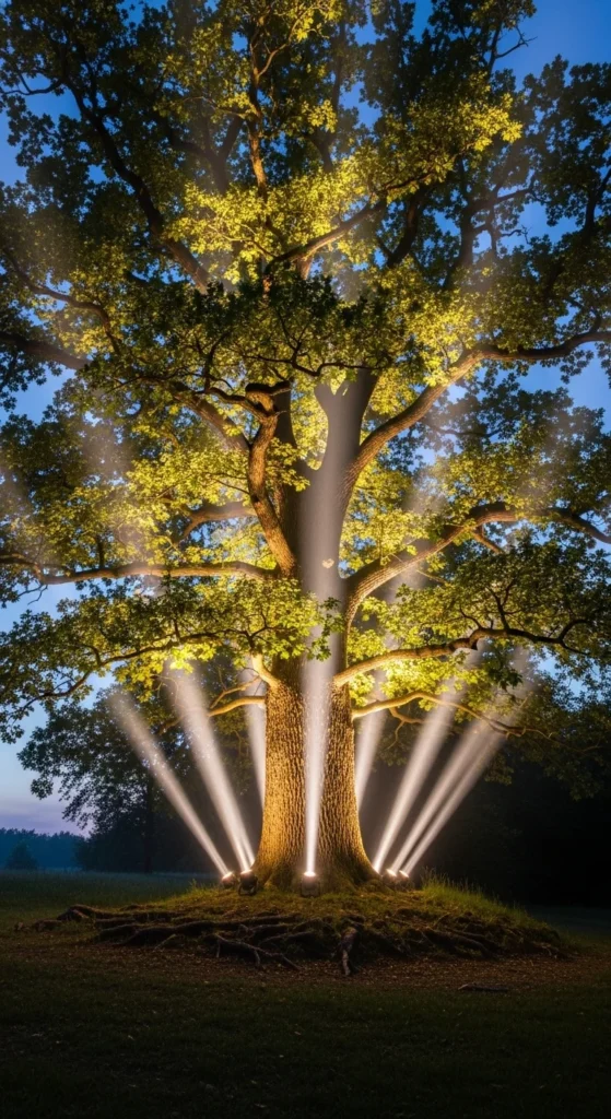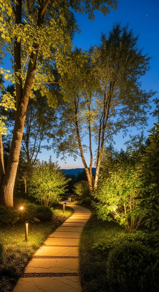 Downlighting mimics moonlight. Install small lights high in a tree and aim them downward. The light spreads across the ground softly. This style works well for wide yards and paths. Keep wires hidden along the trunk. Use dim lights for the most natural look. Downlighting adds depth without overwhelming the garden.