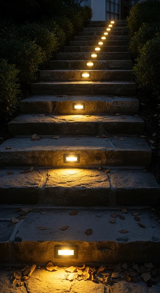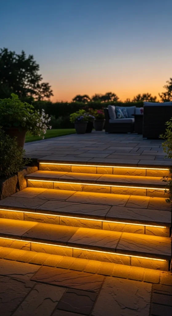 Patio steps become safer and prettier with step-edge lighting. Install LED strips under each tread. Choose warm light for comfort. These strips stay protected under the step edges. They create a soft glow that pairs well with string lights or lanterns. Clean them occasionally to maintain brightness.