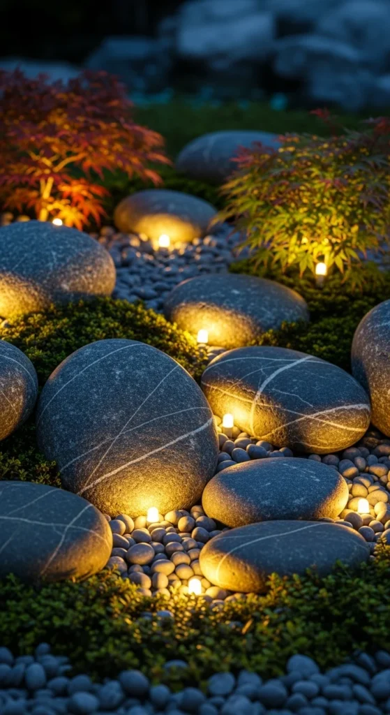 Rock gardens look amazing at night with subtle lighting. Place small spotlights between stones. Aim them at textured surfaces. Keep bulbs low wattage to avoid harsh glare. Pair the lighting with grasses or low plants. This setup creates a calm and grounded evening atmosphere.