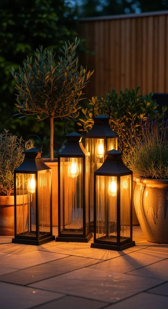 Lantern lights create a gentle ambiance. Use metal or wood frames depending on your style. Place them around seating spots or along patio edges. Add battery candles inside for a soft glow. If you want stronger light, use LED bulbs. These lanterns move easily, so you can shift them for gatherings. Mix heights to add interest. A few lanterns near potted plants help shape a cozy evening area. Keep the glass clean for a clear glow.