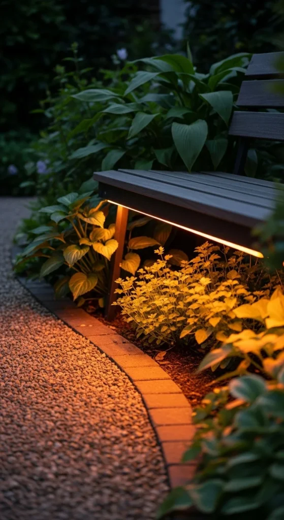 Under-bench lighting brings a gentle glow without being too bright. Install low-voltage LED strips under the seat. The light spreads along the ground, perfect for quiet evenings. This style keeps your seating area visible while maintaining a calm mood. Use waterproof strips so they last longer. You can attach them with adhesive backing or small clips. Pair the bench with pots of lavender or ferns for a relaxing vibe.