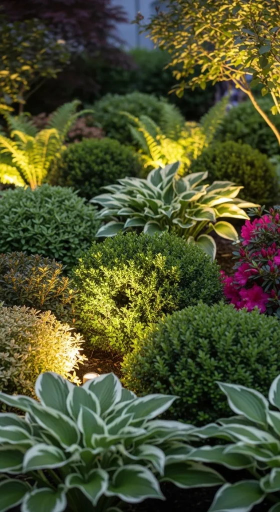 Place tiny ground lights inside shrubs to create depth. The light filters through leaves and casts interesting shadows. Use dim bulbs to avoid harsh brightness. Keep plants trimmed so the lights stay visible. This trick works well near entry paths or patios. You can pair multiple lights for a layered look. Use warm-toned bulbs for softness.