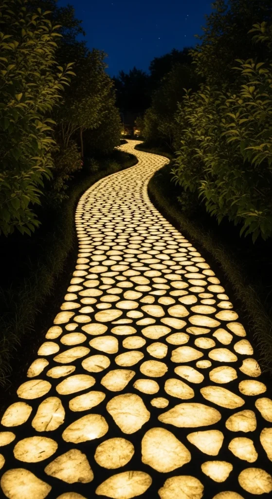 Glow pebbles brighten paths without installing wires. These stones absorb daytime light and gently glow in the evening. Spread them along the edges of walkways or sprinkle them between pavers. They help guide guests without overpowering the area. Glow pebbles work best where they receive plenty of sun. Rinse them occasionally to remove dust. Combine them with solar path markers for a balanced design.