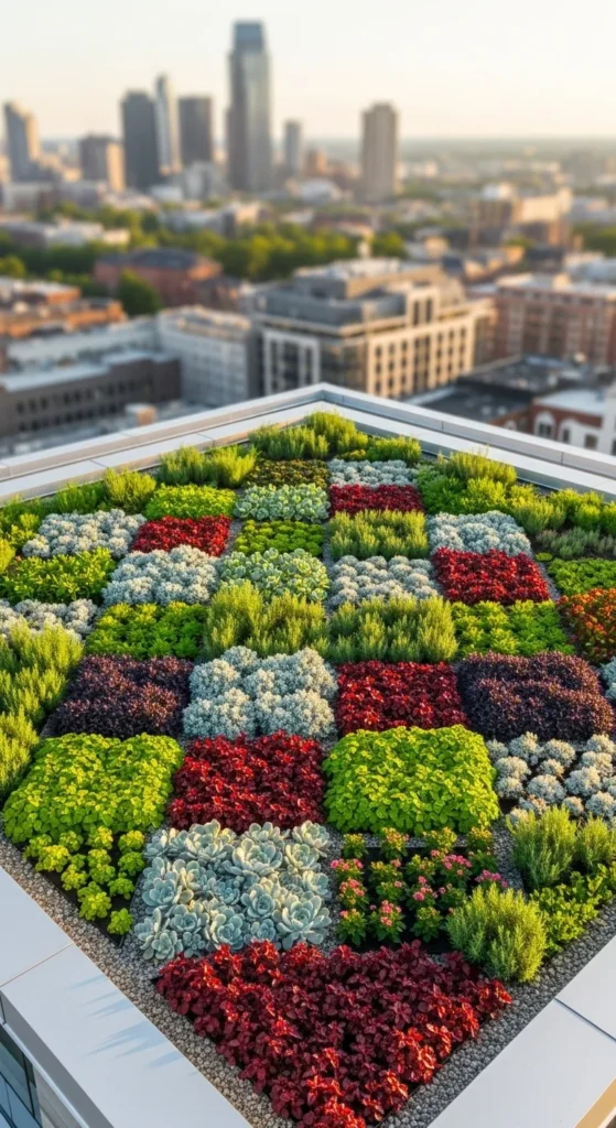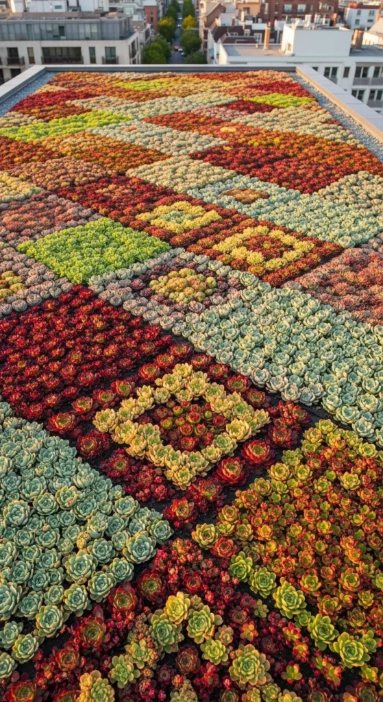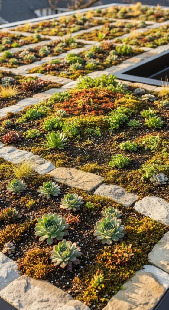 Create a quilt effect by arranging plants of differing textures in geometric zones. Use low sedums, dwarf grasses, small moss patches, and hardy succulents. Keep each section small so the pattern stays clear. Add thin gravel lines between zones for definition. This approach gives the roof a bright, organized look while keeping maintenance simple.