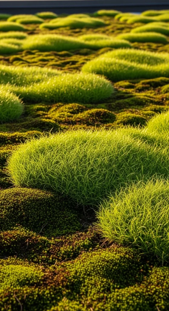 A mix of moss and dwarf grass creates soft transitions across your living roof. Moss handles shade while grass performs well in light. Plant patches in staggered patterns. Mist moss lightly and water grass at soil level. These textures work together to build a natural, calming surface. It’s an easy way to add variety without extra weight.