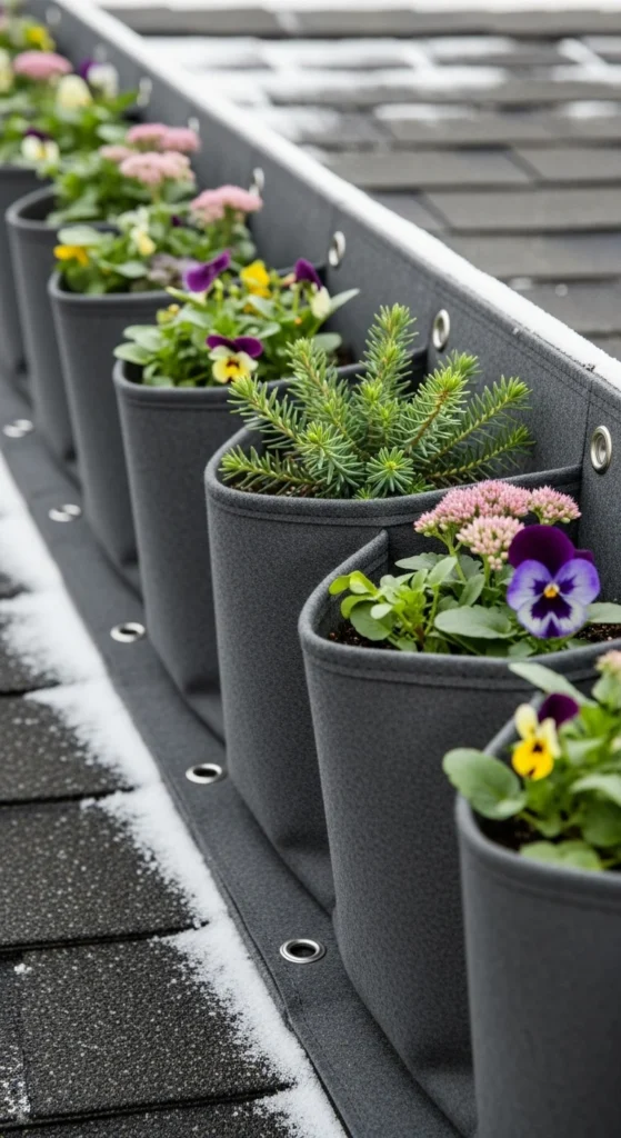 Pocket planters offer small planting zones without covering the entire roof. Attach them to the parapet or railing using strong hooks or brackets. Fill each pocket with lightweight soil and hardy plants like thyme, dwarf grasses, or alpine flowers. Keep watering light so soil stays firm. Rotate plant varieties throughout the year for seasonal color shifts. This method suits smaller roofs where full installations aren’t practical.