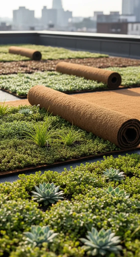 Eco-mats provide instant coverage. They arrive pre-planted with hardy species and unroll directly onto the surface. Add a moisture-retaining layer beneath them. Water lightly after installing. Eco-mats help fill empty areas quickly and add structure while you build long-term planting zones. They are simple to place and replace as needed.