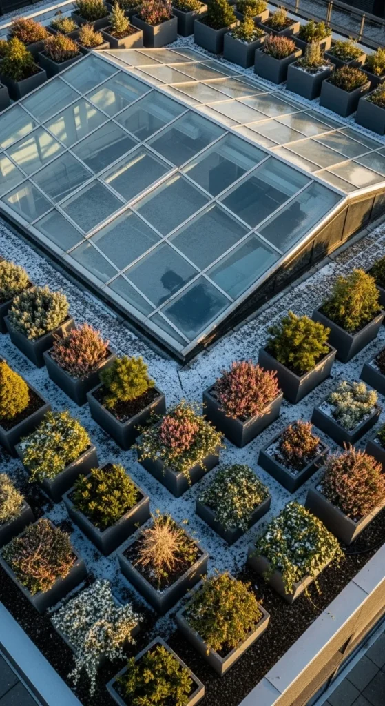 Place lightweight planters around skylights to soften hard edges. Use shallow containers to limit weight. Plant durable winter species that stay compact. Keep planters spaced to avoid shading the glass. This setup connects the structural elements to the living parts of the roof, bringing cohesion without heavy construction.