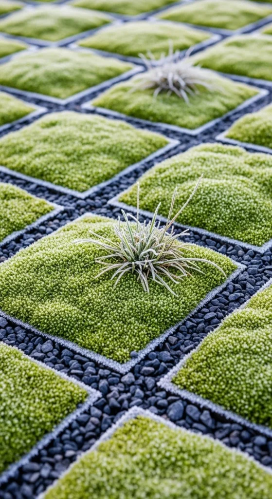 Moss squares thrive in cool, shaded rooftop zones. Create a moisture-retaining surface using fabric mats, then lay moss pieces in a tidy grid. Mist lightly to help them attach. Moss stays green even in low light, offering a soft texture that contrasts well with harder materials. Add small stones between squares for visual interest. This method is light, simple to install, and ideal for rooftops with partial shade.