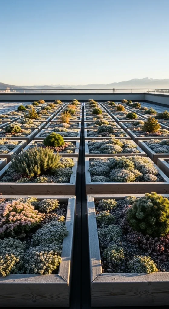 Build small wooden frames filled with lightweight soil to house alpine species. These plants stay compact, handle cold efficiently, and thrive in shallow root zones. Place frames around skylights or vent areas to soften hard edges. Water sparingly and add a thin gravel layer to prevent soil splash. Alpine frames are great for rooftops where low maintenance is important and weight limits exist.