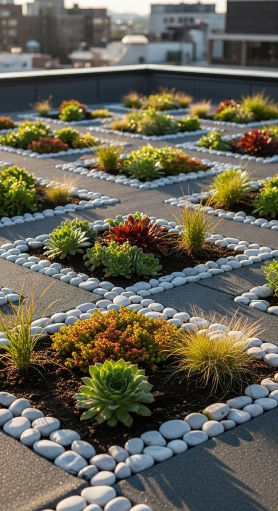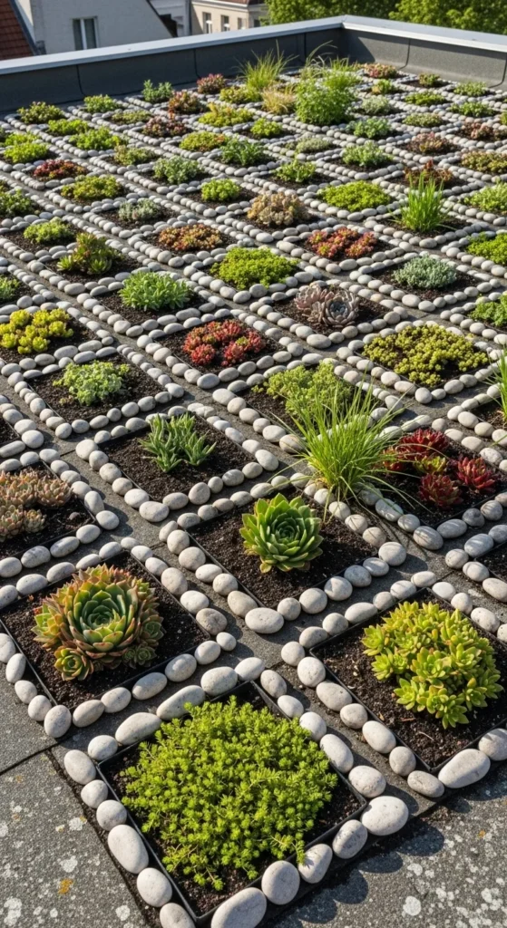 Create mini planting beds on your roof using lightweight stones as borders. Fill each bed with a thin soil layer and plant cold-tolerant species. The stones help frame the beds and reduce soil movement. Add a gravel layer around the edges to create clear separation between beds. This method lets you add structure without major installation work.