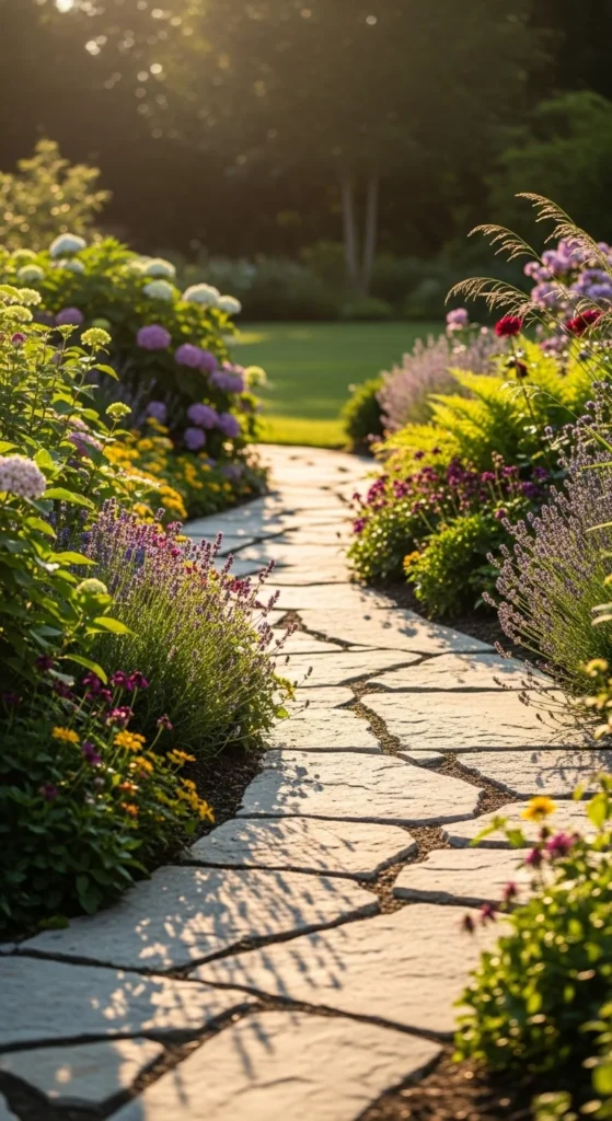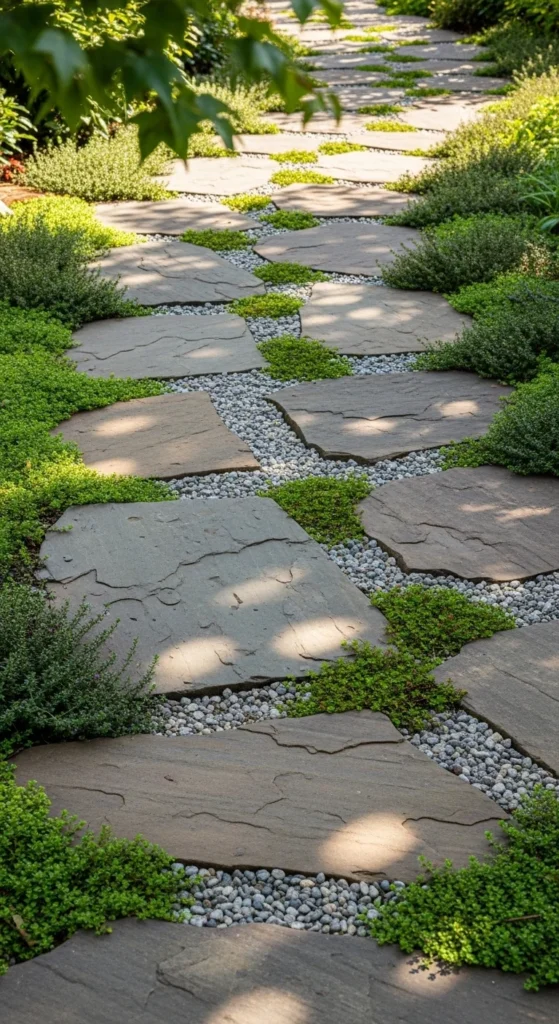 Flagstones create an organic, relaxed look. Leave gaps between stones and fill them with gravel or groundcover. Place larger stones first, then smaller ones. This path fits well in informal gardens. Use local stone to reduce cost.
