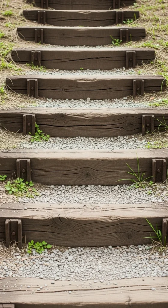 Railroad ties make great risers for sloped paths. Place ties horizontally and fill the center with gravel. This design handles uneven ground well. Seal the wood for longevity. It’s a sturdy, rustic option for hillside gardens or sloping yards.