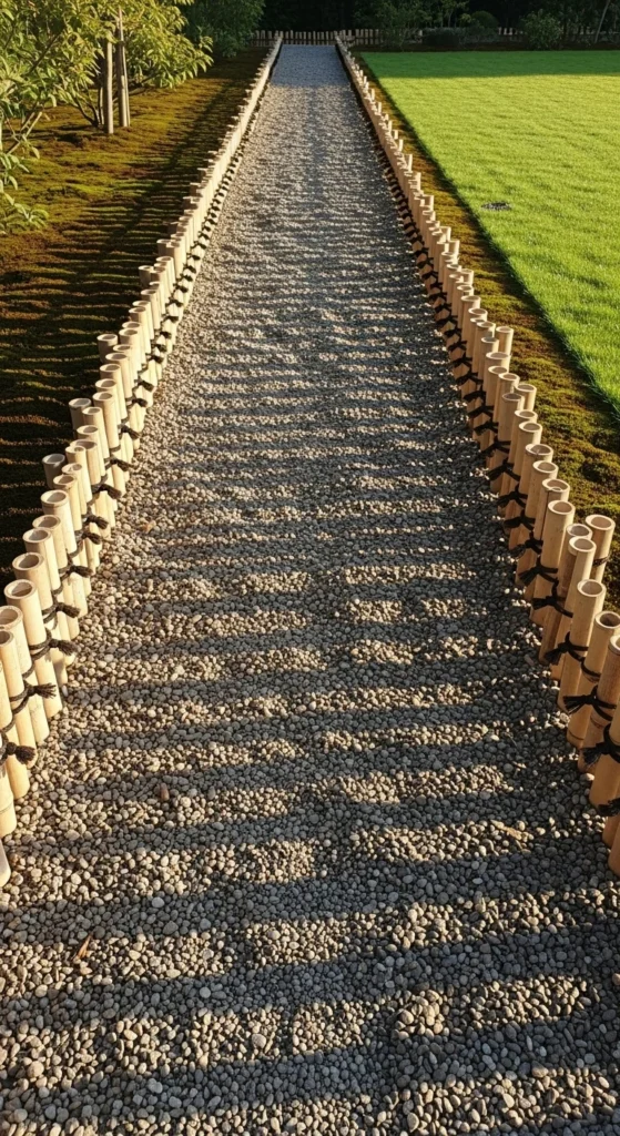 Bamboo edging adds a natural frame to a simple path. Cut bamboo into short pieces and secure them along both sides. Pair with gravel or mulch. This approach suits Asian-inspired gardens or minimalist yards. It’s also inexpensive if you source bamboo locally.