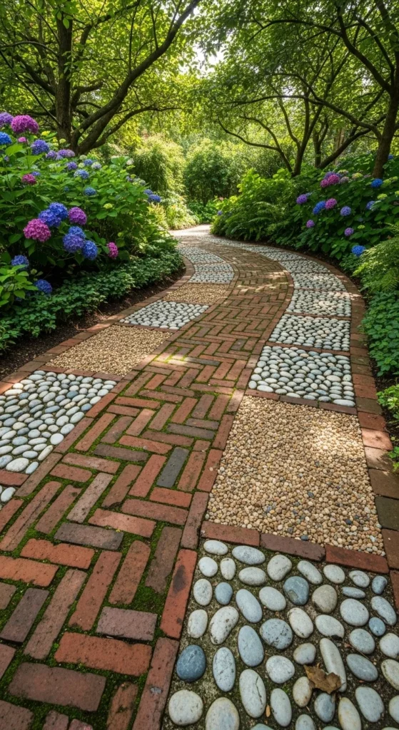 Mixing materials creates visual interest without needing a full overhaul. Use leftover bricks, stones, or pavers. Arrange them in sections along a winding path. Add gravel or mulch between transitions. This is a great way to use scrap materials and create a unique walkway.