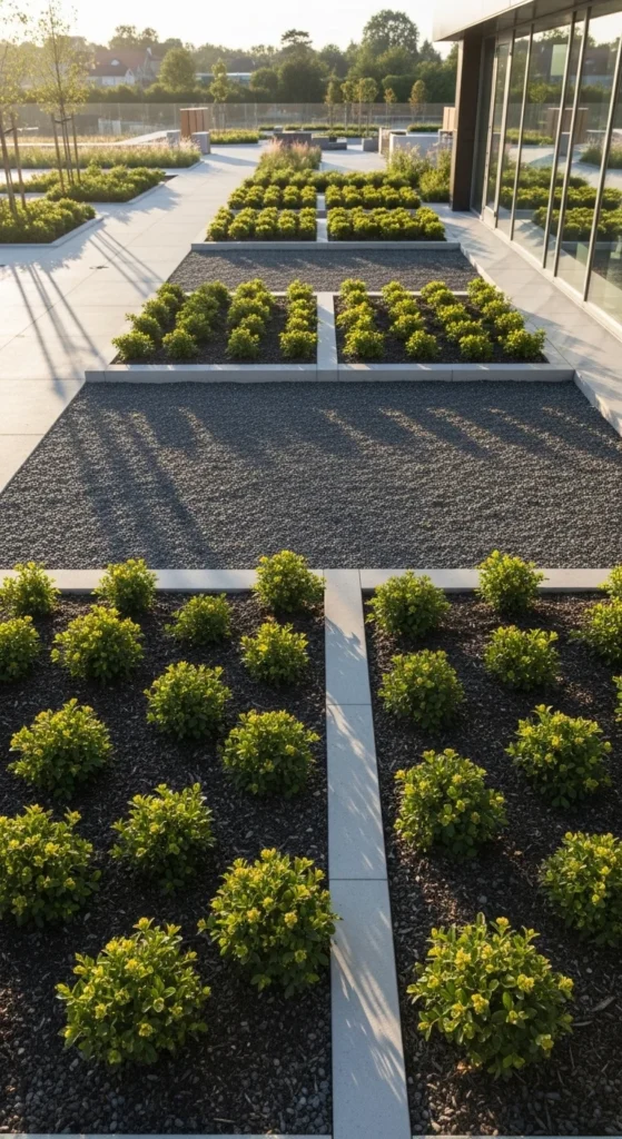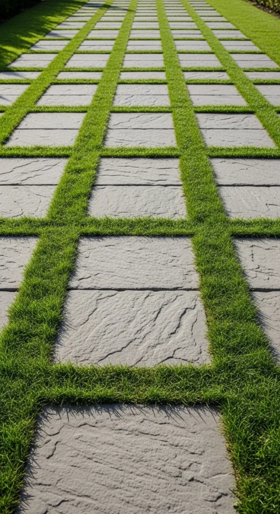 This layout mixes hardscape with greenery. Space large pavers apart and grow grass or low groundcover between them. Keep lines straight for a geometric effect. Water the grass strips regularly until established. This path works beautifully for front yards or patios.
