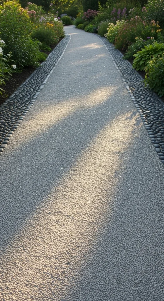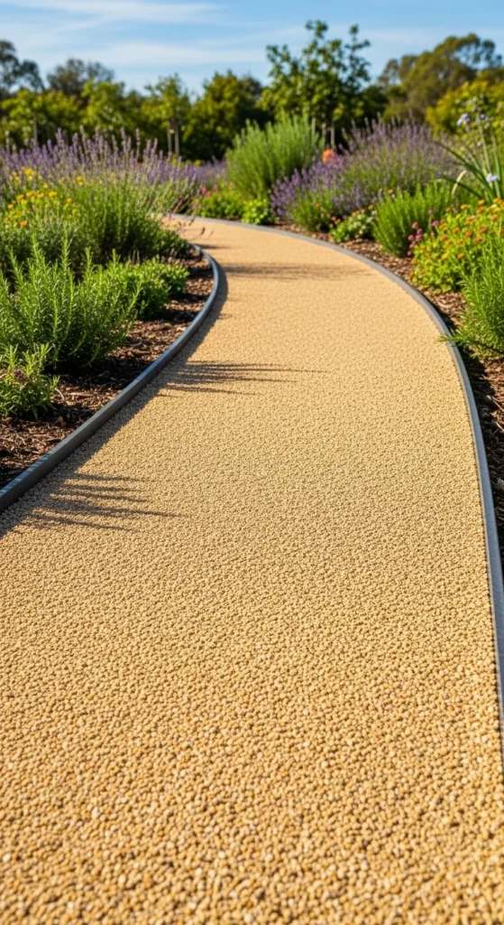 Steel edging gives a modern finish to loose materials. Install steel strips along both sides, then fill the center with decomposed granite. Compact it lightly. This is great for clean, structured gardens. Steel lasts long and keeps lines sharp.