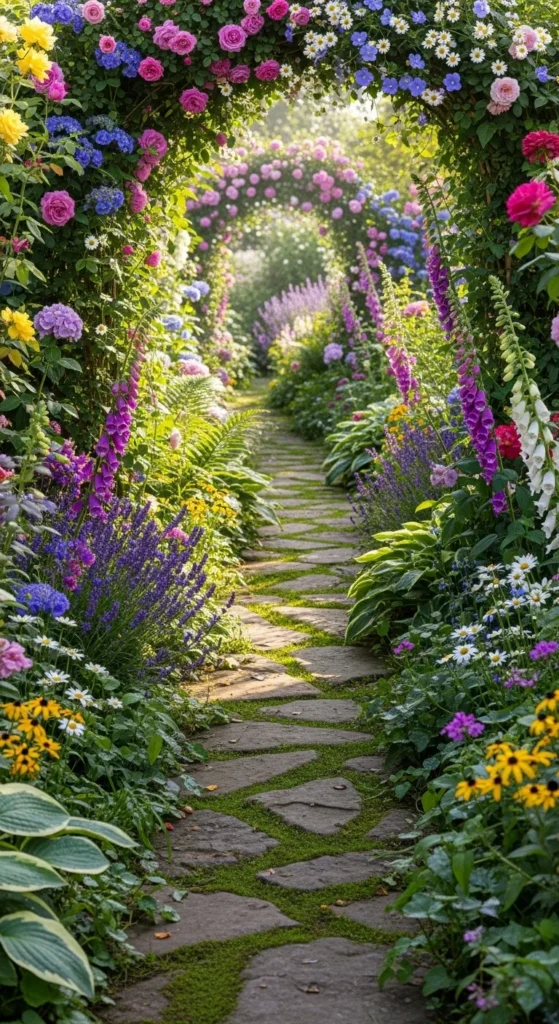 A flower-framed path creates charm and color. Plant low blooms like alyssum, dianthus, or lavender along both sides. Keep the path narrow so flowers frame it nicely. Refresh mulch or gravel yearly. This suits cottage, romantic, or farmhouse-style gardens.