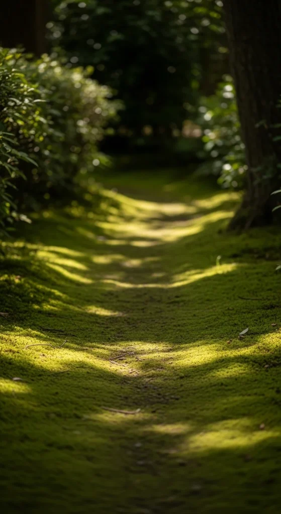 Moss paths thrive in shady, moist areas. Clear the soil, level it, and plant moss sheets or patches. Keep them moist until they settle. Moss needs little care and feels soft underfoot. This path brings calm energy to quiet corners.