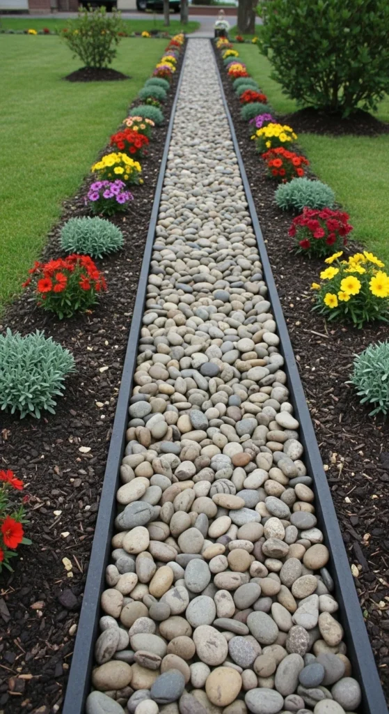 River rocks create a flowing, soft line through the garden. Dig a shallow trench, fill with rocks, and smooth the top. This acts as both a path and a visual guide. It pairs nicely with ferns, hostas, and ornamental grasses. It’s also very low maintenance.