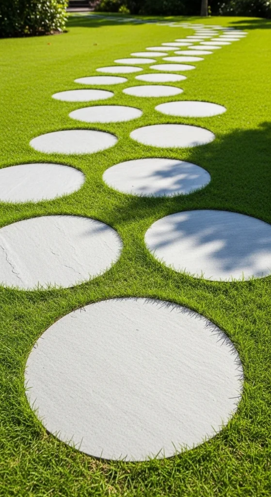 Large stepping pads give structure to open lawn areas. Set them level with the grass so mowing stays easy. Choose circular or square pads for a crisp look. Space them evenly. This is perfect for connecting patios, sheds, or seating areas.