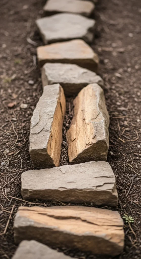 Split stones give a rustic, natural feel. Arrange them loosely along a soil path. Keep shapes irregular. Add mulch or leaves along edges. This design blends well with trees, shrubs, and natural landscapes. It’s great for woodland gardens or relaxed backyard spaces.