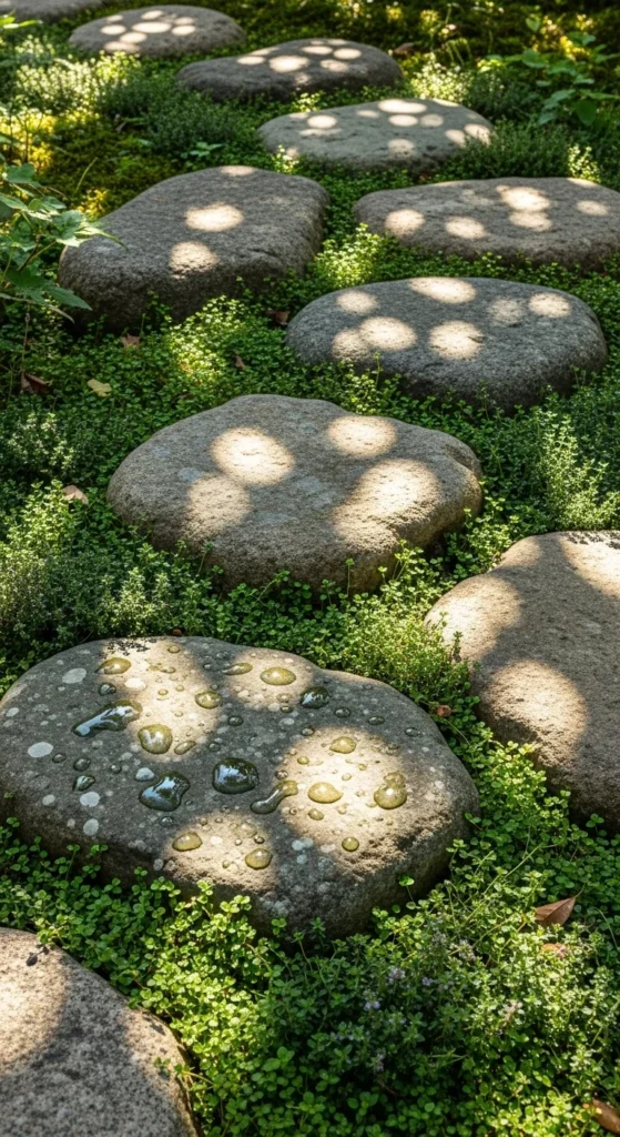 Stepping stones create a relaxed, inviting look. Place them on soil and plant creeping thyme or clover around the edges. These plants fill gaps and soften the design. Keep stones spaced so walking feels comfortable. Use reclaimed stones if you want to save money. This style works beautifully near patios or shady corners.