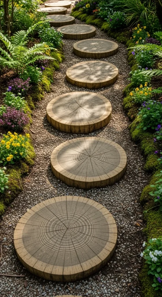 Wood slices create a natural woodland feel. Collect thick logs and cut them into slices. Place them securely into soil or sand so they stay stable. Fill gaps with mulch or gravel. Seal the wood to extend lifespan. This design works well under trees or near play areas. It’s a low-cost, eye-catching option.