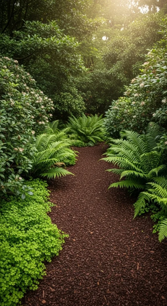 Mulch paths are soft, quiet, and budget-friendly. Spread several inches of bark mulch and refresh yearly. Use logs, branches, or stones as edging. Mulch suits shady gardens, forest-style beds, or natural areas. It’s easy to install with basic tools. Keep weeds down by adding a layer of cardboard below.
