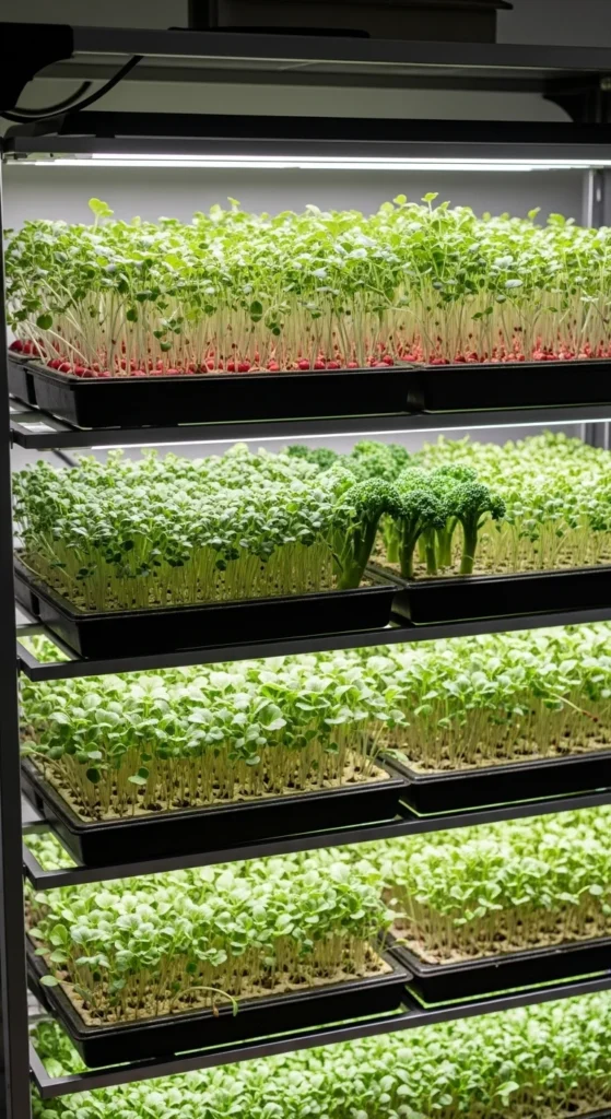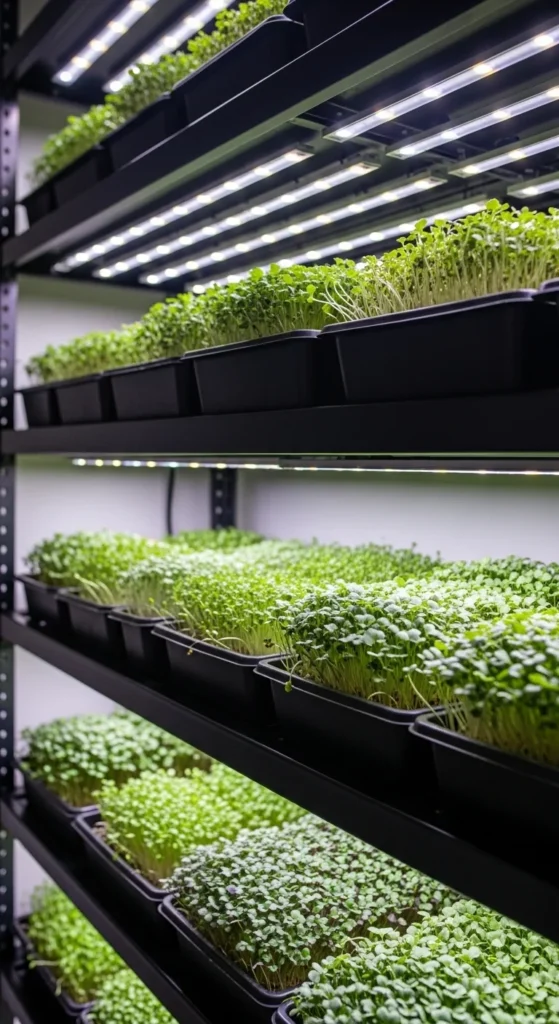 A shelf system lets you grow large quantities at once. Place grow lights on each tier, set trays on the shelves, and stagger your plantings. This setup works well for families or meal prep routines. It provides consistent lighting and airflow. You can grow several varieties at once without taking much floor space. This system works year-round.