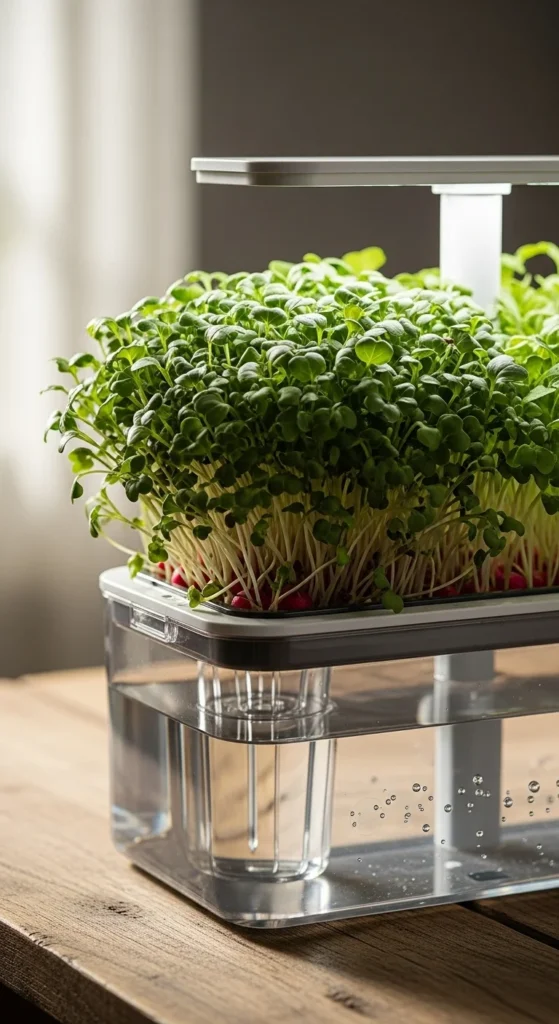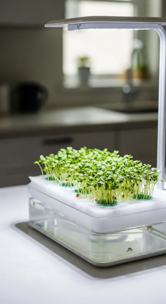 Hydroponic kits grow microgreens without soil. They use moisture pads that stay damp as seeds sprout. Place the pads in the tray, add water to the base, and sprinkle seeds on top. Keep the water level steady. This method grows greens quickly and reduces mess. These kits work well for kitchens and small apartments. You’ll only need to refill the tray occasionally.