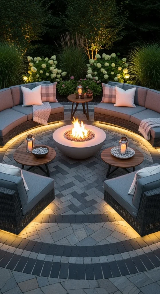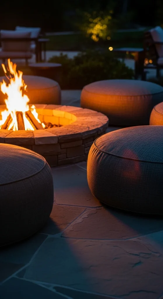 Place the fire pit at the center and keep chairs arranged evenly around the circle. For a budget option, buy basic concrete pavers instead of specialty stone. Add a few cushions with outdoor-safe fabric to soften the seating. Sweep ash and leaves regularly so the area stays tidy. This style works well for patios that need more structure without building permanent walls.