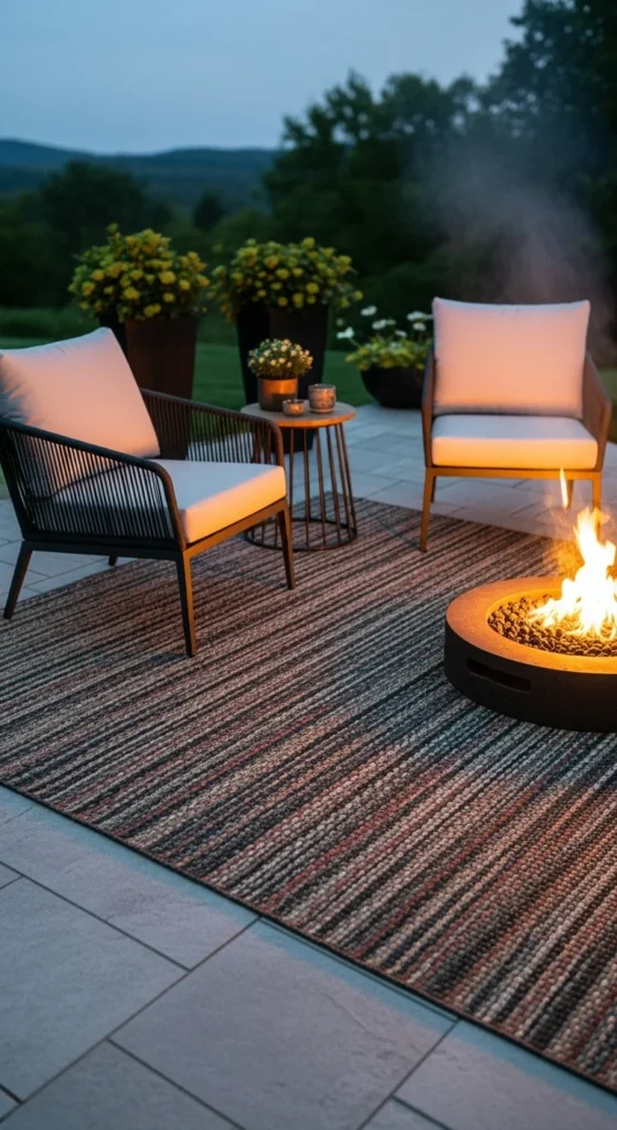 Outdoor rugs soften the ground and make the fire area feel more like an outdoor living room.